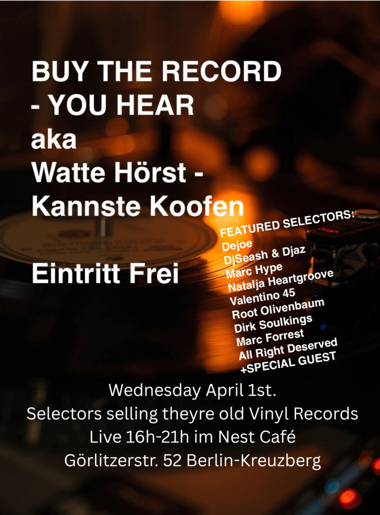 Join us on Wednesday, April 1st, at Im Nest Café for a unique and vibrant evening as selectors showcase and sell their treasured old vinyl records live. From 16:00 to 21:00, immerse yourself in the rich, nostalgic sounds of classic tunes and discover rare finds to add to your collection. Located at Görlitzerstr. 52 in the heart of Berlin-Kreuzberg, this event is the perfect opportunity for music enthusiasts of all ages to connect over a shared love of vinyl. Best of all, entry is free, so bring your friends, family, and fellow music lovers for an unforgettable experience. Don’t miss out on the chance to explore the timeless magic of vinyl records in a warm and welcoming atmosphere!