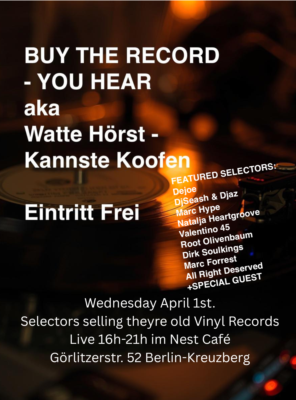 Join us on Wednesday, April 1st, at Im Nest Café for a unique and vibrant evening as selectors showcase and sell their treasured old vinyl records live. From 16:00 to 21:00, immerse yourself in the rich, nostalgic sounds of classic tunes and discover rare finds to add to your collection. Located at Görlitzerstr. 52 in the heart of Berlin-Kreuzberg, this event is the perfect opportunity for music enthusiasts of all ages to connect over a shared love of vinyl. Best of all, entry is free, so bring your friends, family, and fellow music lovers for an unforgettable experience. Don’t miss out on the chance to explore the timeless magic of vinyl records in a warm and welcoming atmosphere!